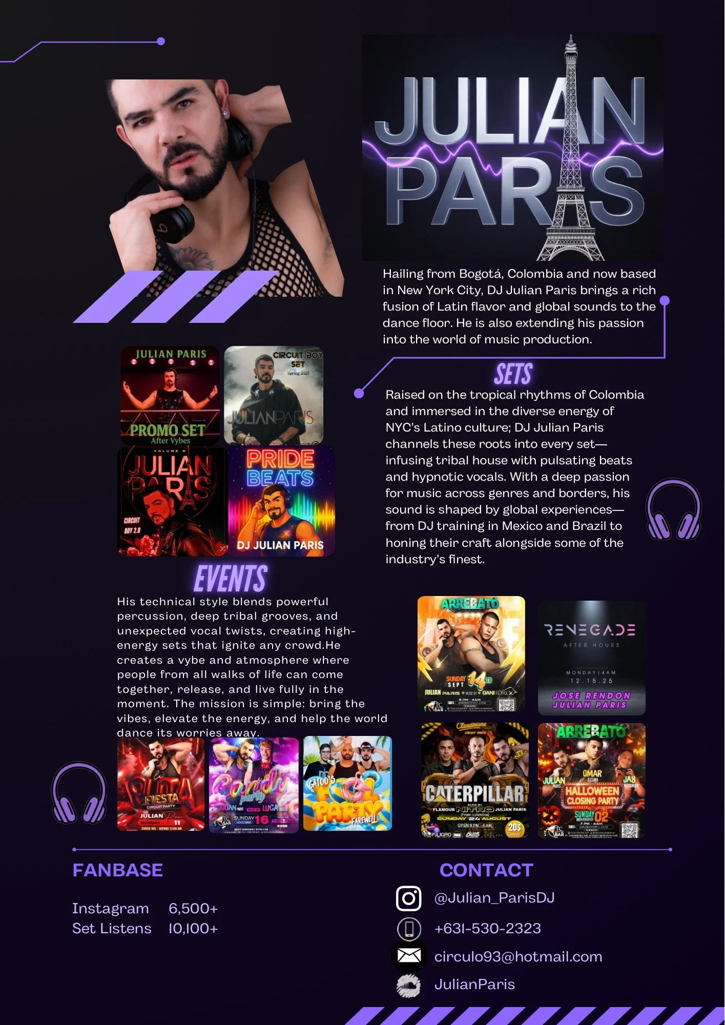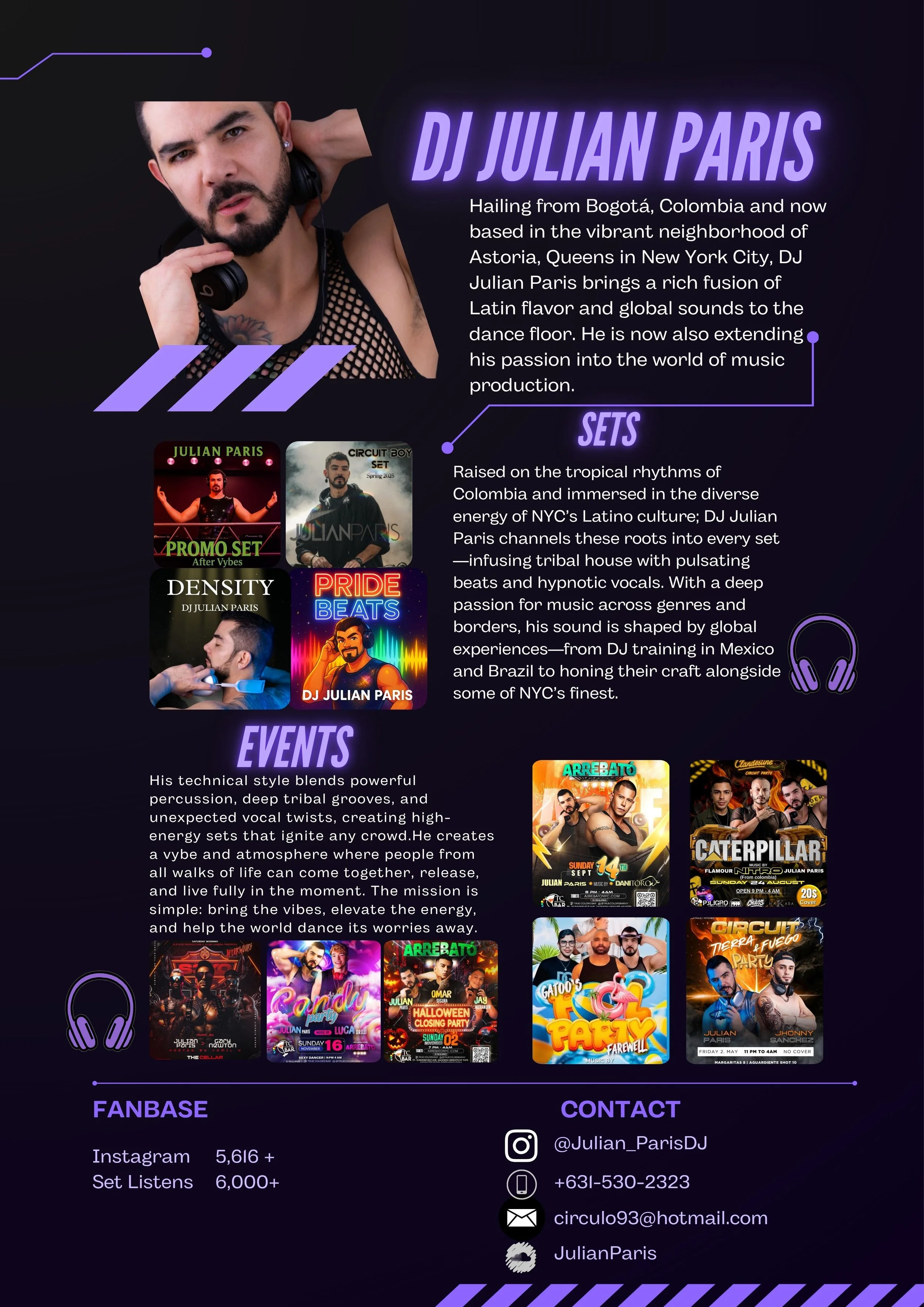 Raised on the tropical rhythms of Colombia and immersed in the diverse energy of NYC’s Latino culture; DJ Julian Paris channels these roots into every set—infusing tribal house with pulsating beats and hypnotic vocals. With a deep passion for music across genres and borders, his sound is shaped by global experiences—from DJ training in Mexico and Brazil to honing their craft alongside some of NYC’s finest.